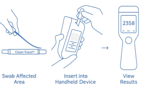 Je gaat met een watje over een vastgesteld oppervlakte van een voorwerp en neemt hiermee ATP op in het watje. Dit watje gaat in een buisje, waarin de chemische reactie plaatsvindt. Vervolgens gaat buisje in de meter en heb je binnen 30 seconden een resultaat.