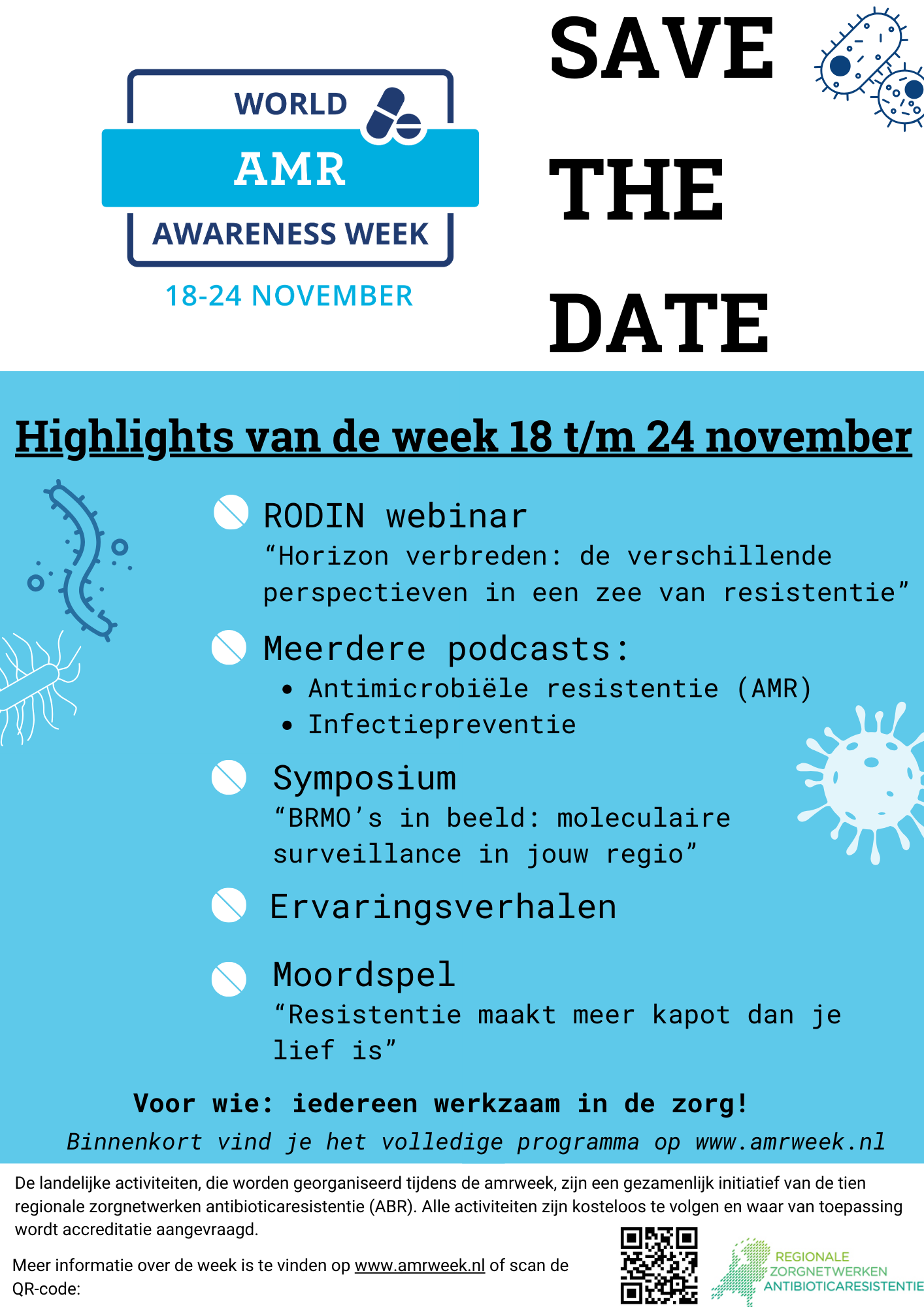 De regionale zorgnetwerken Antibioticaresistentie werken samen om tijdens de World Antimicrobial Awareness Week van 18 tot en met 24 november met deelnemende zorginstellingen aandacht te vragen voor de strijd tegen antibioticaresistentie.